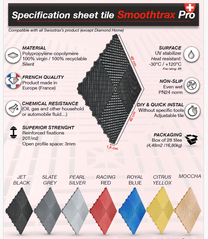 SMOOTHTRAX PRO, Polypropylen-Fliesen mit einer leicht offenen Struktur und einer flachen Oberseite. Es handelt sich um ein innovatives Produkt, das das führende Modell RIBTRAX Pro ergänzt.